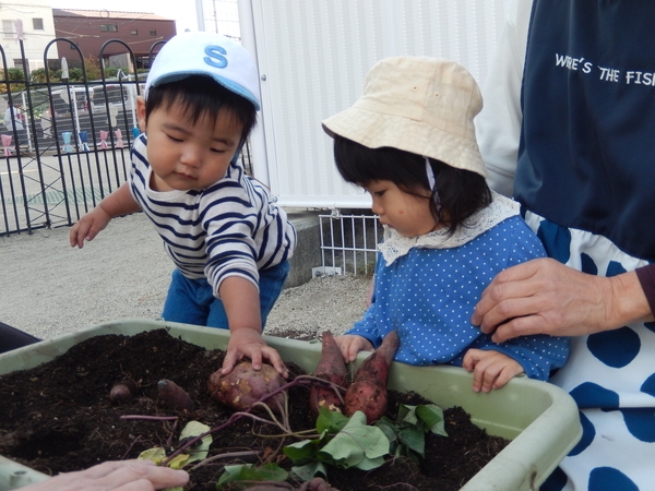 おいもほり🍠 青空の下、さくら組・すみれ組の子どもたちは、広~いお芋畑でたくさんのお芋を掘ってきました。 土の中からお芋が出てくると嬉しくて「みてみて~このおいもでっかいでぇ!」「こっちはねぇ、ちいさくてかわいい~」と大興奮!! 自分たちで掘ったお芋の味は、最高に美味しかったことでしょう♬ 次の日、0・1・2・3歳児クラスのみんなもお芋掘りを楽しみました。