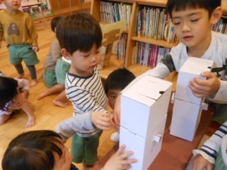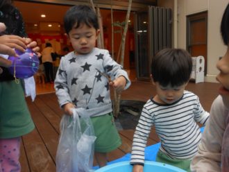21日(土)は4・5歳児さんの秋まつりでしたが、25日(水)には0~3歳児さんにもお祭りの雰囲気で楽しんでもらおうと「おまつりごっこ」をしました。