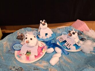 顔は紙粘土を丸めて作りました。「柔らかくてフワフワして気持ちいいね」など感触も味わいながら作っていました。足は細長く、目や鼻等は小さく丸めたりと手先を使って製作を楽しみましたよ。絵の具で色をつけパーツを貼りつけました。パーツの大きさや形が一人ひとり違い、一つ一つ表情の違うシロクマが出来ました🎵