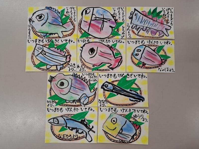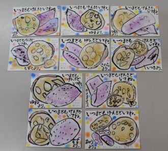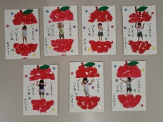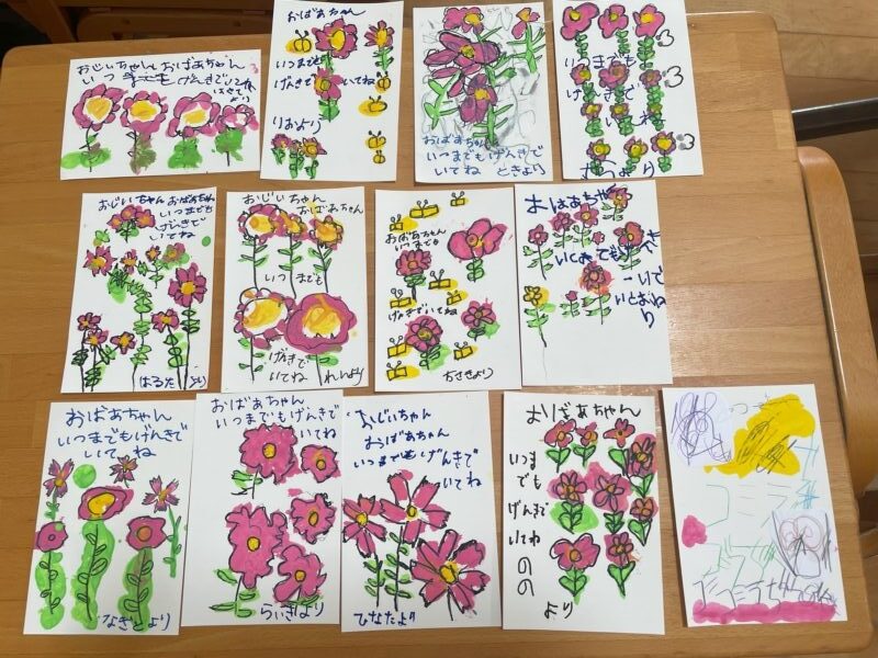 敬老の日に合わせ、子ども達が大好きなおじいちゃん・おばあちゃんにハガキを作りました。