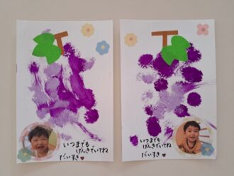 スタンプでぶどうを作りました。ポンポンしたり手を大きく動かして楽しそうに作っていました。