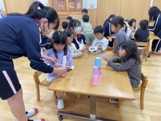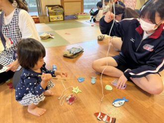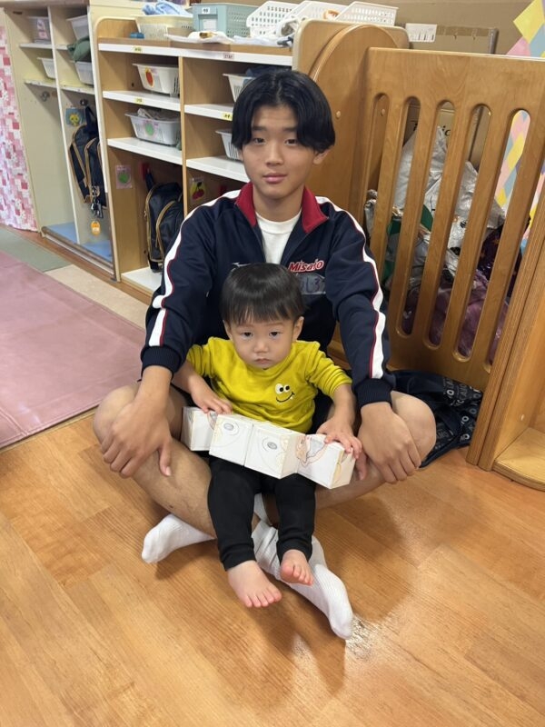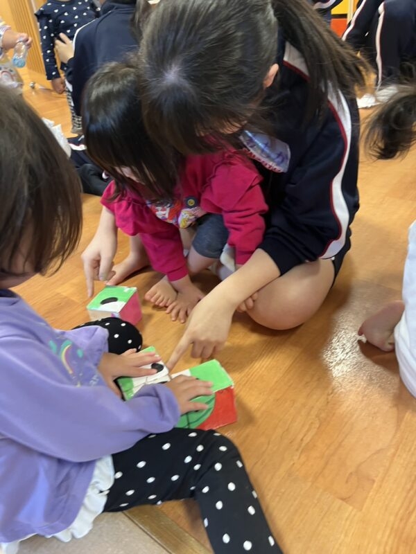 乳児組さんの目線に合わせて話しかけてくれたり、手作りのおもちゃで一緒に遊んでくれました。