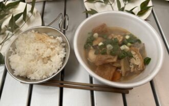 飯盒で炊いたのでおこげもできていて、寒いけどキャンプしたくなりますねと話も盛り上がりました😊芋炊きの味変にどうぞと、地産の柚子胡椒と辣油を準備してくださっていたんですがこれまた美味しい!お鍋の味、うどんや餃子のたれなどにも良いと色々教えてくださり、日頃の食卓に楽しみができました。
