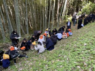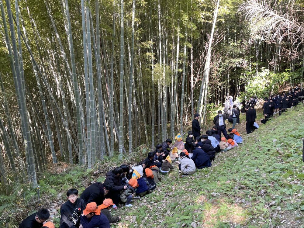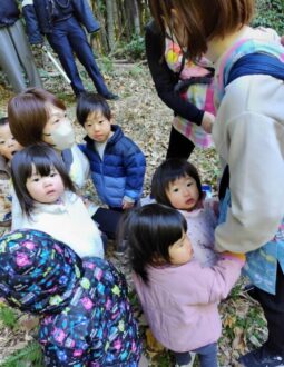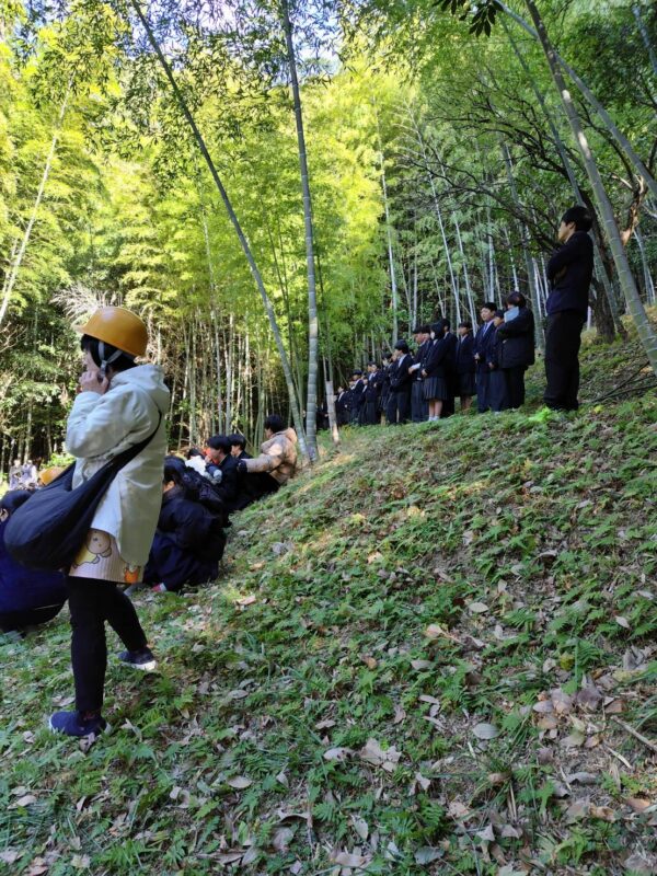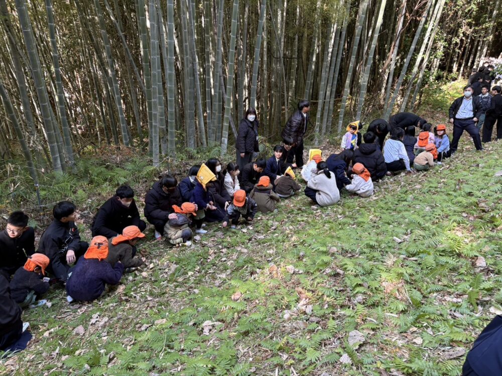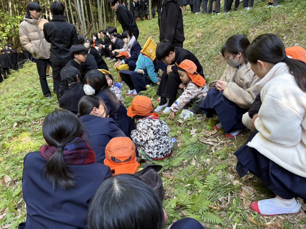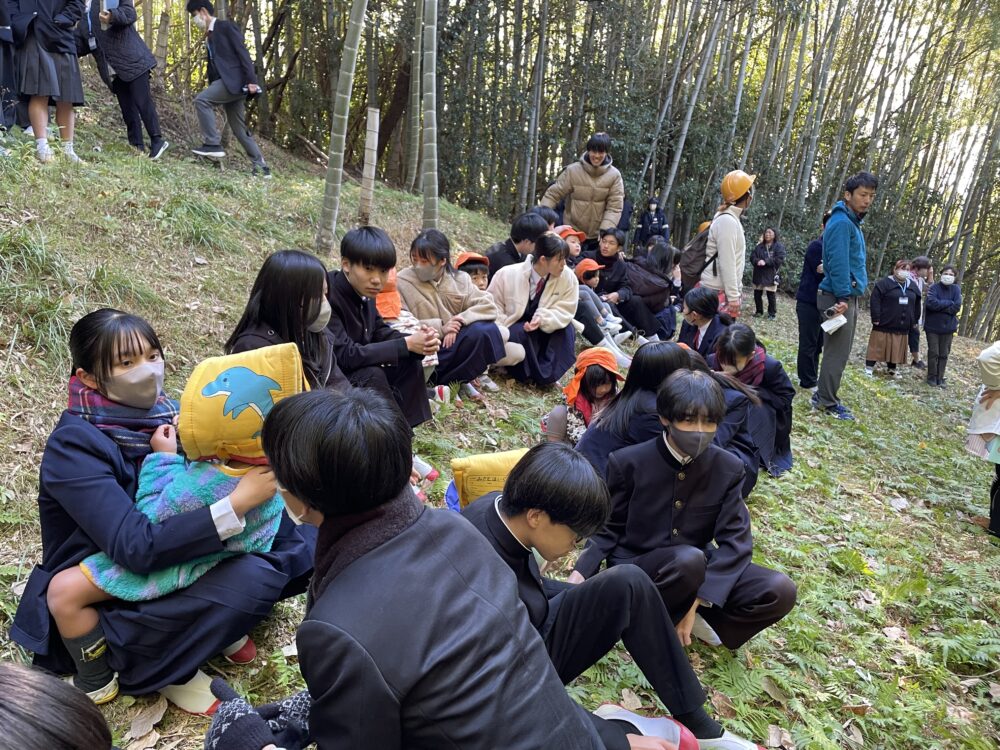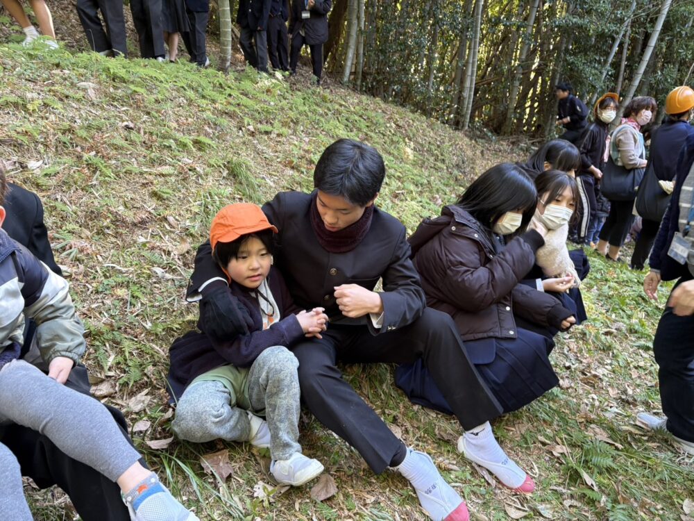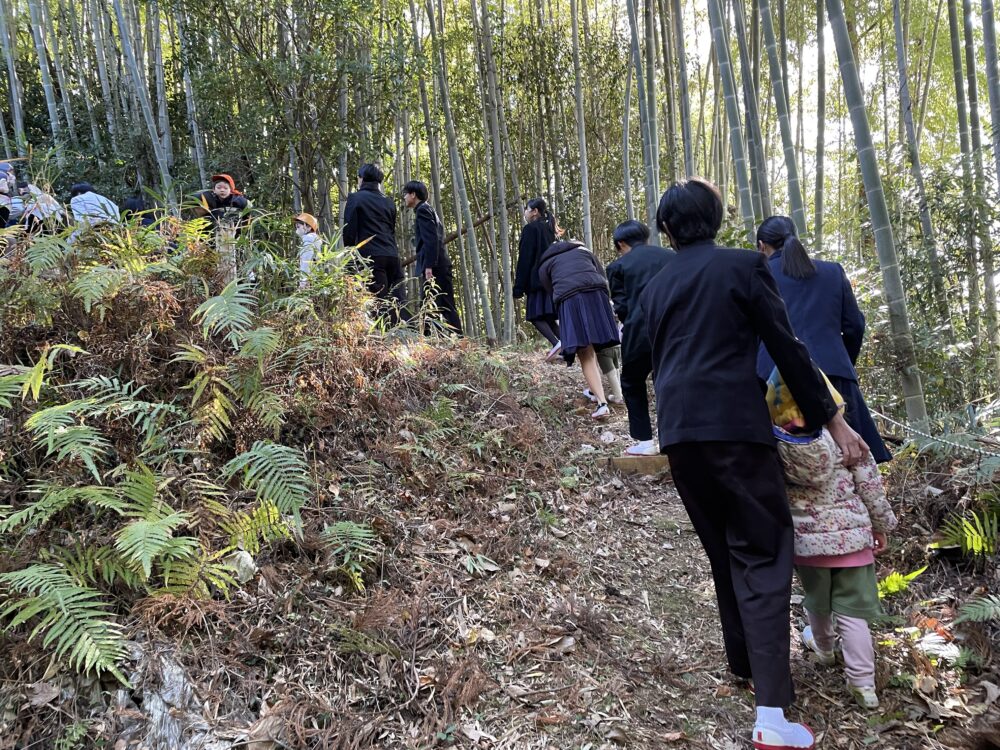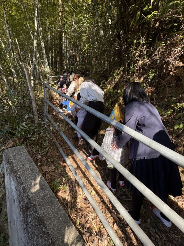 中学校では3年生が待ってくれていて2歳児以上は手をつないでもらい、小学校裏のみかん山に上がりました。